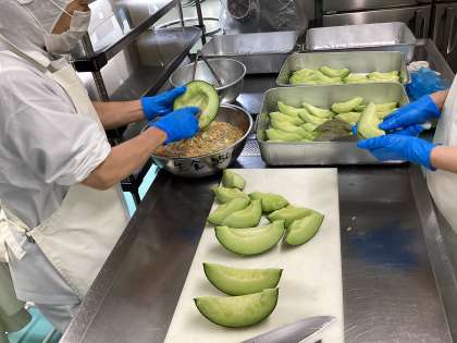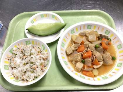 今日の給食は、鮭と青菜のごはん、いりどり煮、メロン、牛乳です。