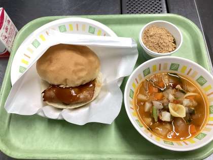 今日の給食は、照り焼きチキンバーガー、ミネストローネ、黒蜜寒天です。
