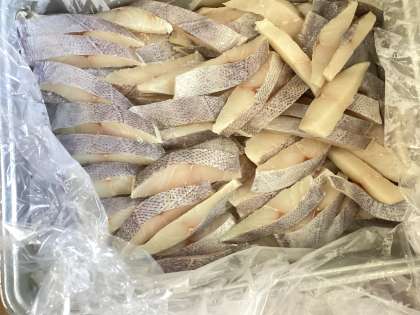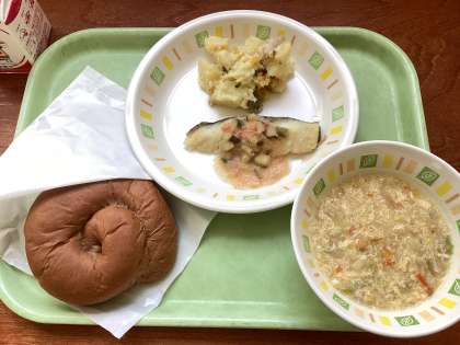 今日の給食は、ココアパン、メダイのエスカベージュ、カルボナーラポテト、キャベツと卵のスープです。