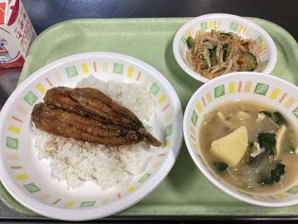 今日の給食は、いわしのかば焼き丼、もやしのごま酢あえ、じゃがいもと玉ねぎのみそ汁、牛乳です。