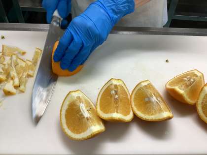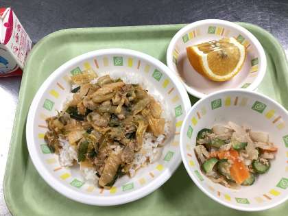 豚キムチ丼、ツナと大根のサラダ、くだもの(甘夏)の給食です。1年生は、辛さを控えめに調整し、作っています。