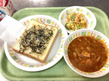 今日の給食は、じゃこトースト、トマトシチュー、コールスローサラダ、牛乳です。