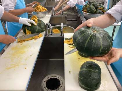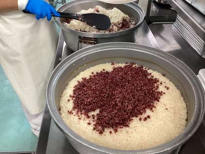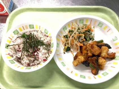 今日の給食は、梅茶漬け、いかとかぼちゃの揚げ煮、三色ナムル、牛乳です。