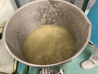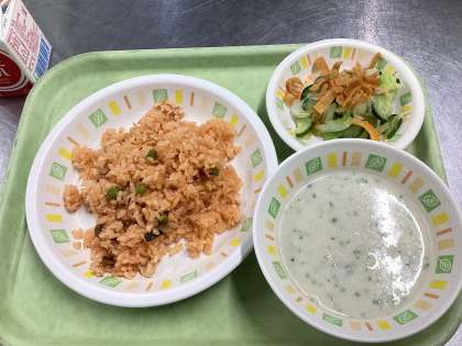 今日の給食は、チキンライス、ポテトポタージュ、パリパリサラダ、牛乳です。