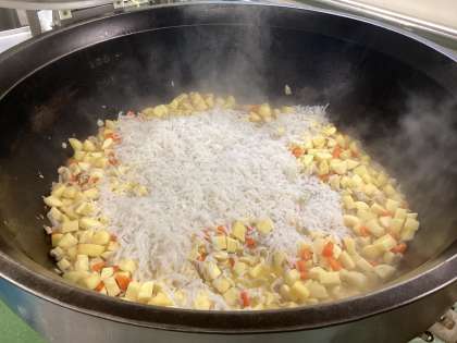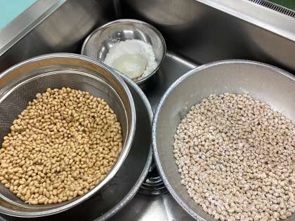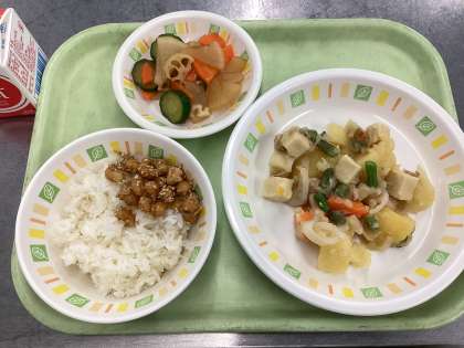 今日の給食は、七分つきごはん、大豆とじゃこの甘辛あげ、塩鶏じゃが、シャキシャキ野菜、牛乳です。