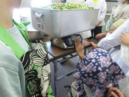 1・2校時に4年生が、今日の給食で使う枝豆の鞘とりを行いました。