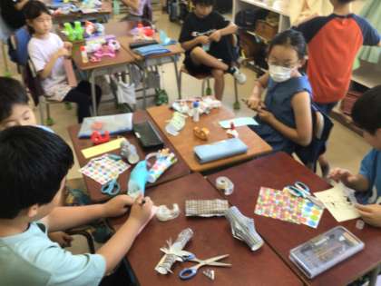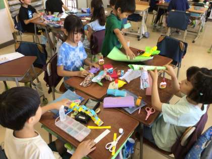 先週末から図工室の冷房が故障してしまい、今週の図工は可能な学年は教室で行っています。3年生も予定を変更して、今日の七夕にぴったりの七夕飾りを作ることにしました。