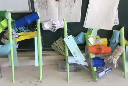 自分用七夕飾りは、「ちょうちん」「貝がら」「ふき流し」「あみ」などから3つ作ったり、願い事の短冊を書いたりして、自作の笹に見立てた棒に飾り付けました。
