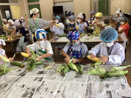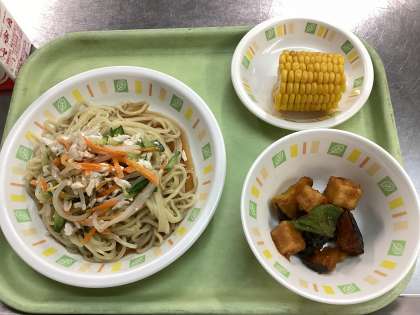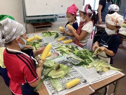 今日の給食は、高野豆腐と夏野菜の揚げ煮、蒸しとうもろこし、牛乳です。2年生がとうもろこしの皮をむいてくれました。