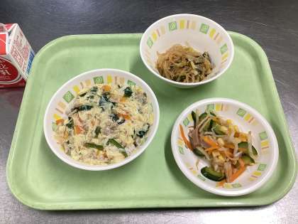 今日の給食は、クッパ、チャプチェ、五色あえ、牛乳です。1学期の給食の牛乳提供は、今日が最後でした。1年生、4月はたくさん残っていた牛乳ですが、1本飲めるようになってきました。