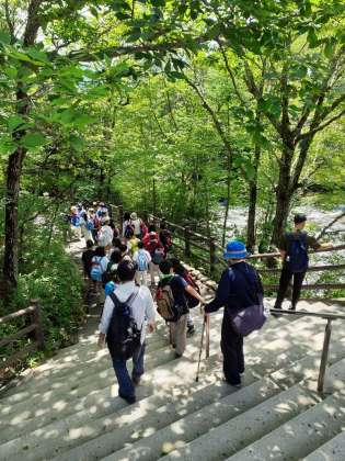 日光林間学園二日目の6年生、奥日光三名瀑の龍頭の滝まで最後のハイキングです。