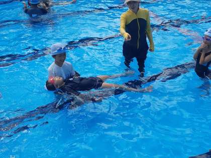 水慣れから、水泳部の6年生に補助してもらいながら、体を浮かせる感覚を味わっていました。