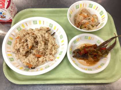 今日の給食は、中華おこわ、ししゃもの南蛮漬け、春雨サラダ、牛乳です。