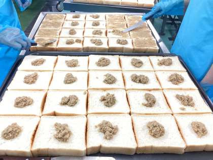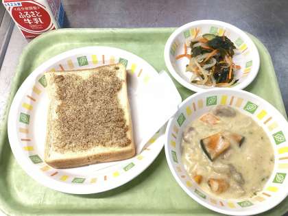 今日の給食は、セサミトースト、パンプキンシチュー、わかめサラダ、牛乳です。