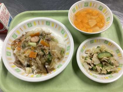 今日の給食は、中華丼、バンバンジー、フルーツポンチ、牛乳です。