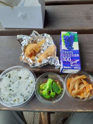 ワカメごはんに、から揚げ、きんぴらごぼう、ブロッコリーのおかか合え、という中身でした。