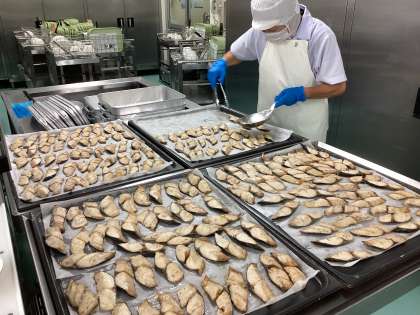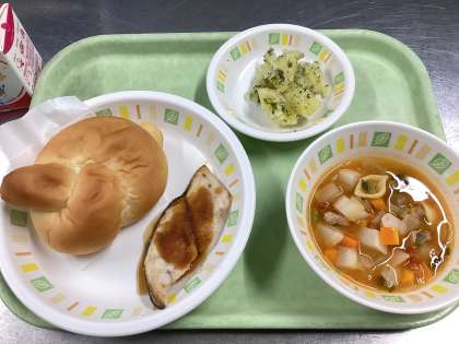 今日の給食は、チーズパン、シイラのムニエルバーベキューソース、粉ふきいも、ミネストローネ、牛乳です。