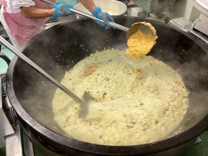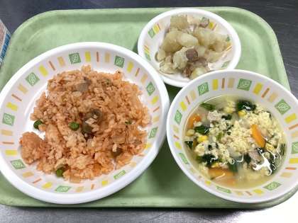今日の給食は、チキンライス、卵とチーズのふわふわスープ、ジャーマンポテト、牛乳です。
