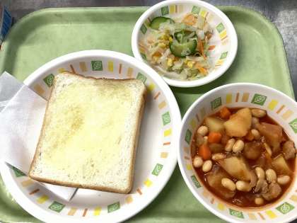 今日の給食は、シュガーバタートースト、ポークビーンズ、コールスローサラダ、牛乳です。