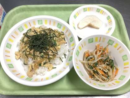 今日の給食は、親子丼、三色ナムル、なし(新高)、牛乳です。