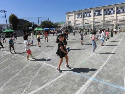鳴子を手に持ち、5年生も舞う「ソーラン節」の曲にのり、