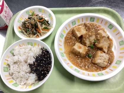 今日の給食は、麦ごはん、ひじきのふりかけ、生揚げのそぼろあんかけ、じゃこ入りおひたし、牛乳です。