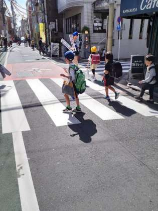 秋空の下、運転する方への注意喚起、子どもたちへの「お帰りなさい」のあいさつ、