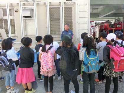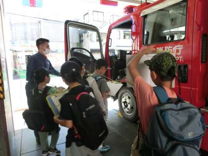 普段は見ることができない消防車の中に何が積んであるのか見せていただいて、「こんなにたくさんのものが積んであるのかぁ。」と驚いていました。また、消防署の中も案内していただき、「通信室」では、実際に指令が入ってきているのも聞くことができました。消防士の方が寝泊まりしているベッドも見せていただき、消防士の方の仕事の様子の一端を感じることができました。