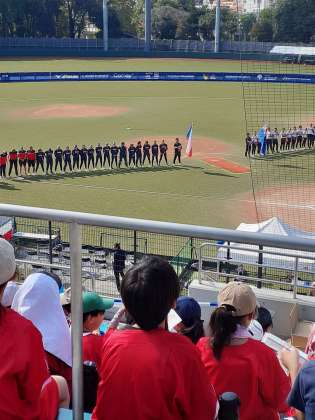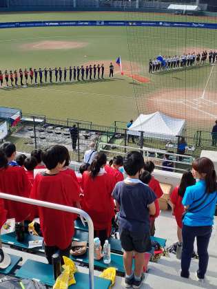 試合前のスターティングメンバーの紹介、両国の国歌斉唱、これぞ、国際大会というムードです。