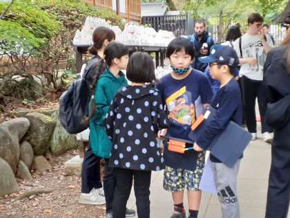 三重塔、井伊直弼のお墓、招き猫とたくさん見学しました。子供たちは、iPadで写真を撮ったり、メモをしたりと見たこと聞いたことを記録していました。