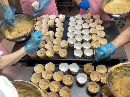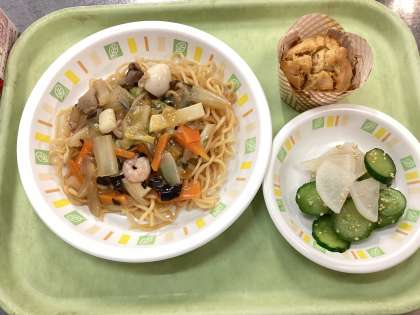 今日の給食は、五目あんかけ焼きそば、きゅうりと大根のごま風味、かぼちゃのマフィン、牛乳です。