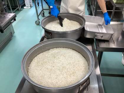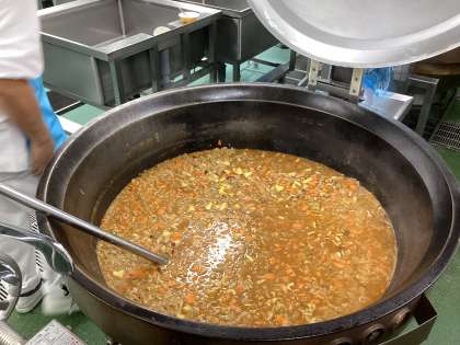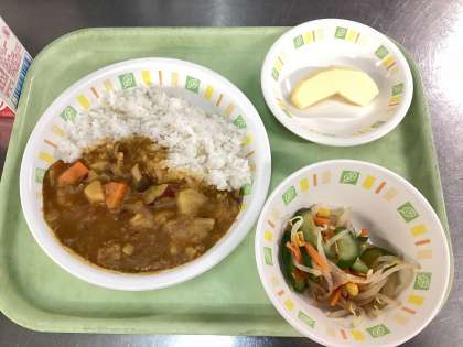 今日の給食は、秋野菜カレーライス、五色あえ、りんご(品種:サンフジ)、牛乳です。今日は、さつま芋のカレーです。