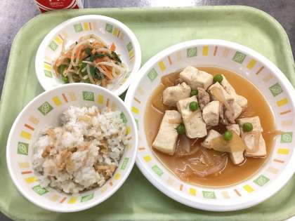今日の給食は、子ぎつねごはん、肉豆腐、野菜の酢みそ和え、牛乳です。