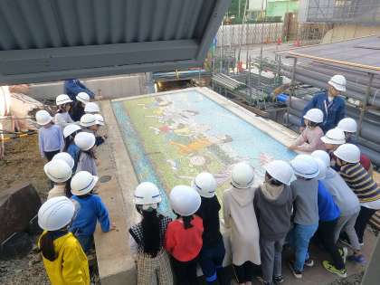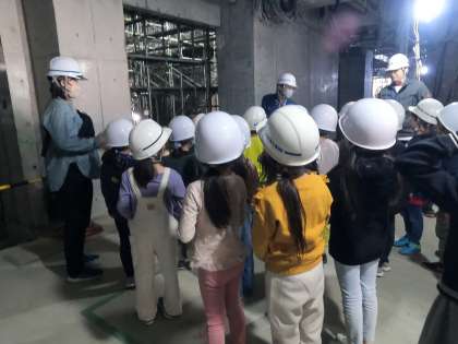 ビデオを見せていただき新しい校舎の説明を受けたり、工事中の校舎に入り中の様子を見学させていただいたりしました。事務所での説明では、新しい校舎の様子を興味深く聞き、その後子供たちがたくさん質問をしていました。ヘルメットをかぶって実際に校舎の中に入ると、その様子にびっくり。「ここが職員室になるよ。」「給食室はこの奥だよ。」「2階のここが昇降口で、下駄箱があるよ。みんなは、ここから教室に入るよ。」などと、たくさん教えていただきました。