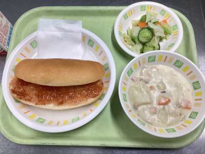 今日の給食は、いちごジャムコッペサンド、サーモンシチュー、フレンチサラダ、牛乳です。