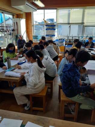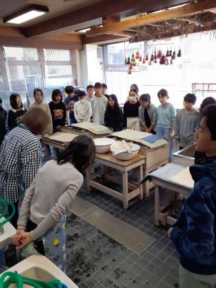 6年1組が、自分たちの卒業証書の台紙になる和紙を漉きに