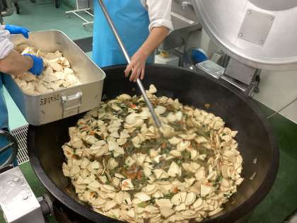 今日の給食は、そぼろごはん、6年生 東北せんべい汁、みかん、牛乳です。今週は、学芸会応援メニューとなっています。