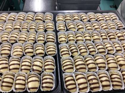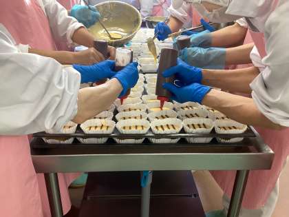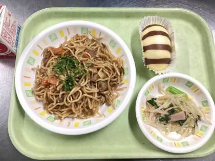 今日の給食は、ソース焼きそば、青梗菜の中華和え、3年生どろぼうむしぱん、牛乳です。むしぱんは、囚人服をイメージして、ココア生地でシマ模様をつけました。