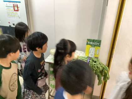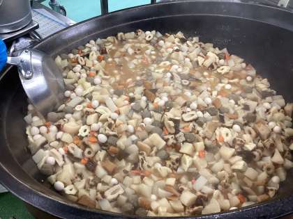 今日の給食は、1年生12月の花火ごはん、大蔵大根のおでん、黒蜜寒天、牛乳です。今日は、世田谷区で収穫された大蔵大根を使っています。給食室前に、丸い先端が特徴の大蔵大根を展示しました。