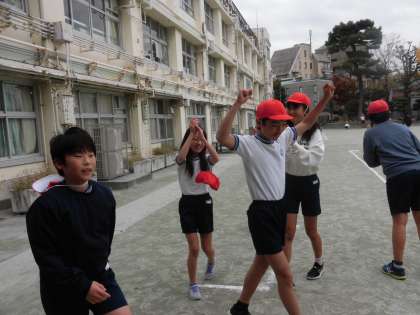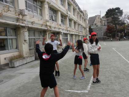校庭体育で、大歓声を上げながら、Tボールを楽しんでいました。