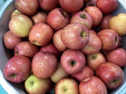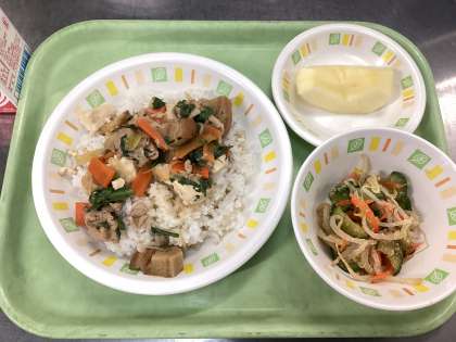 今日の給食は、すき焼き丼、もやしのごま酢和え、りんご(品種:フジ)、牛乳です。