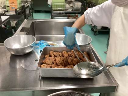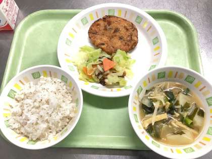 今日の給食は、麦ごはん、手作りさつま揚げ、キャベツの塩昆布和え、じゃがいもとわかめの、みそ汁、牛乳です。