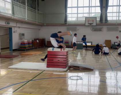 授業のはじめや、休憩時間には宙返りなどの技を