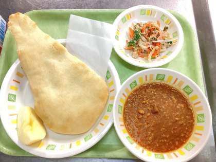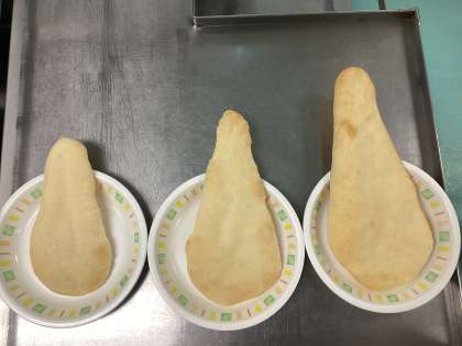 今日の給食は、キーマカレー&ナン、こまツナサラダ、りんご(品種:サンフジ)、牛乳です。ナンの大きさを比較してみました。低学年、中学年、高学年の小麦粉の量をかえています。