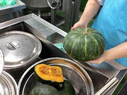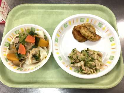 今日の給食は、ほうとう、青のりフライドポテト、ツナのごまドレサラダ、牛乳です。明日は冬至です。