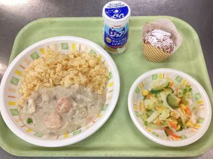 今日の給食は、キャロットライスクリームソースがけ、コールスローサラダ、シュートレーン風マフィン、ジョアです。2学期の給食は今日で終わりになります。保護者の皆様、日頃より学校給食にご理解、ご協力をいただき、ありがとうございます。来年もどうぞよろしくお願いいたします。