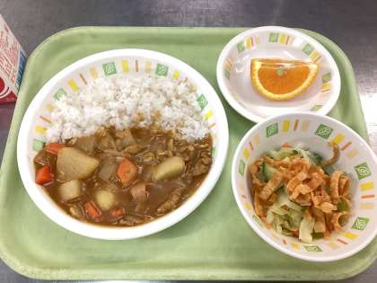 今日の給食は、冬野菜のカレーライス、パリパリサラダ、スイートスプリング、牛乳です。パリパリサラダは、3年生のリクエストメニューです。本年も安心安全な給食提供をしてまいります。よろしくお願いいたします。