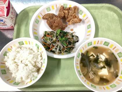 今日の給食は、有機米ごはん、鶏肉のからあげ、野菜の乾物和え、豆腐とわかめのみそ汁、牛乳です。