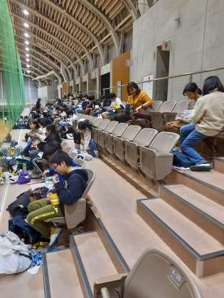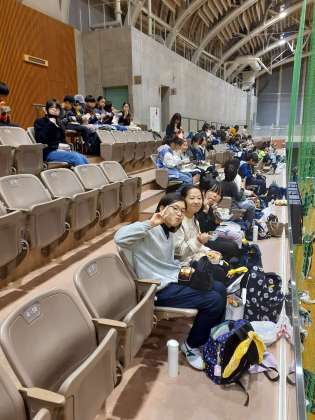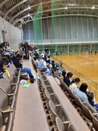 5年生の社会科見学、お弁当タイムは、平塚市立のアリーナの観客席でいただきました。