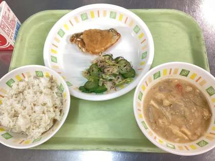今日の給食は、七分つきごはん、さばのおろしあんかけ、野菜のゆかりあえ、呉汁、牛乳です。